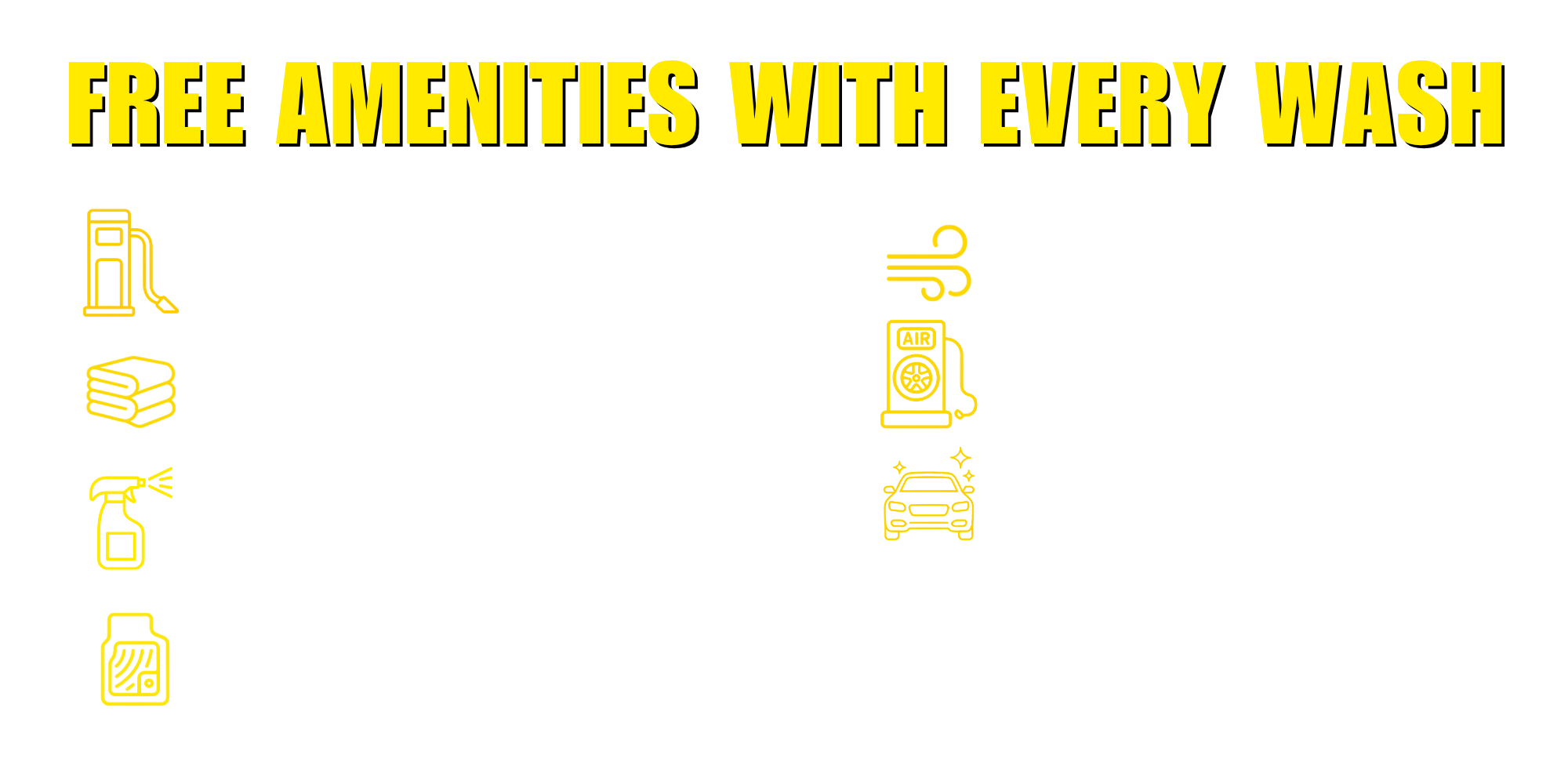 Every wash visit includes all these FREE amenities: vacuums, clean towels, all-purpose cleaner, window cleaner, rubber and cloth mat cleaners, and compressed air blaster to remove dirt, dust, debris and water!